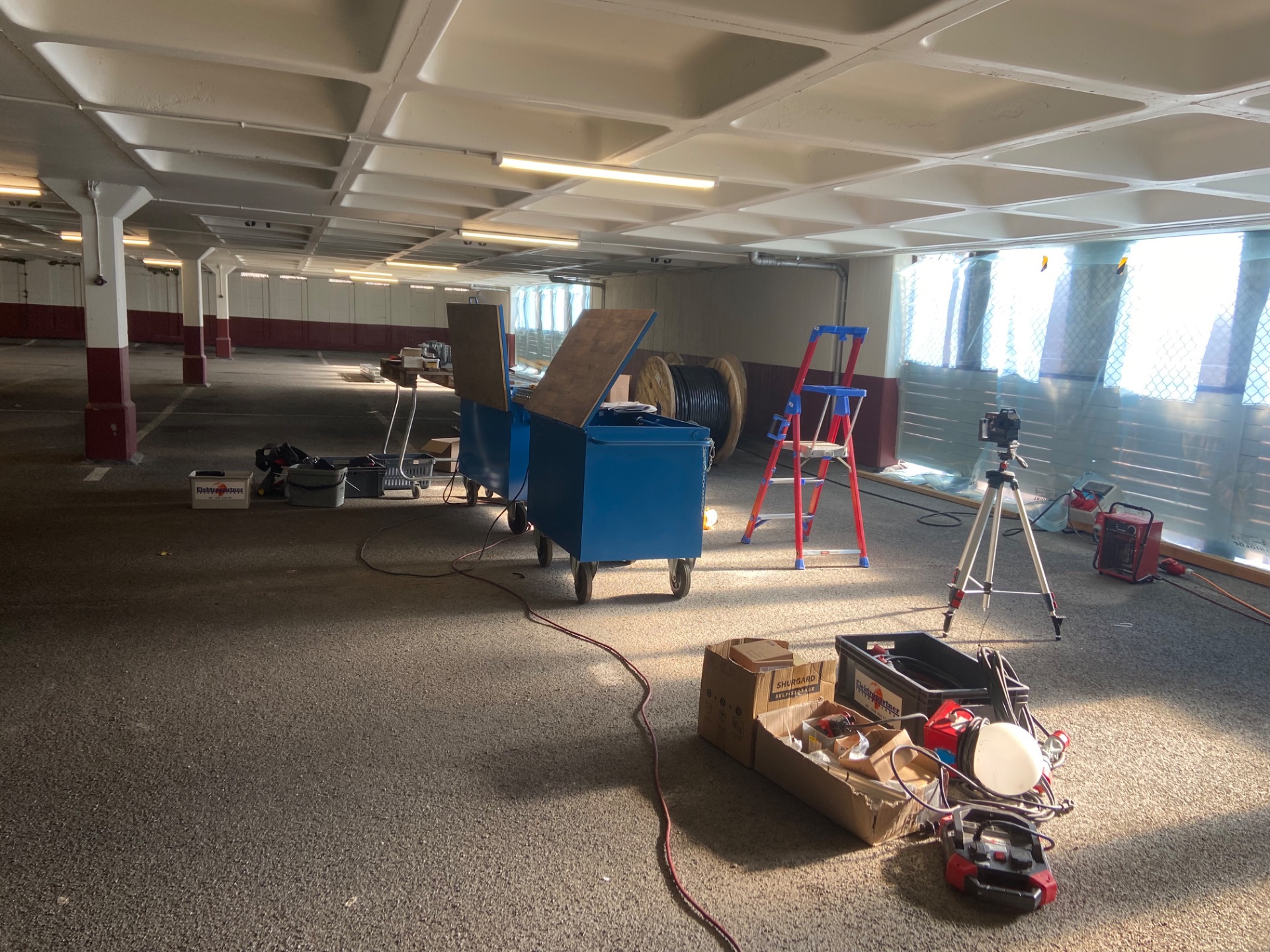 Arbetet med dragning av kablage till framtida laddboxar pågår parallellt nu i B-garaget och garagelängor B nedre.